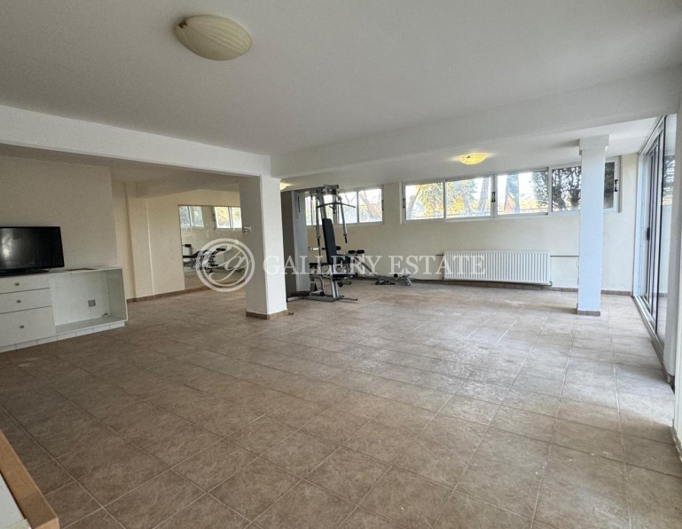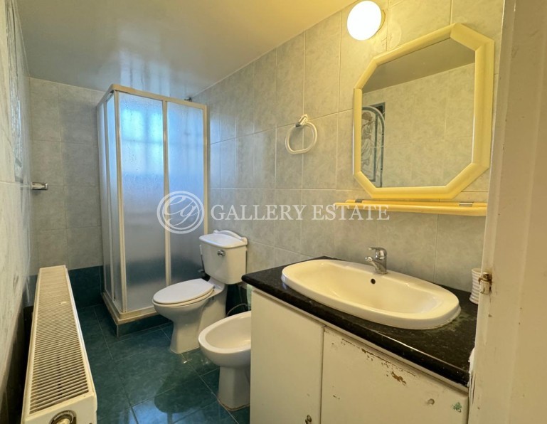 The basement level includes a storage area, a large room that can be used as a gym or multipurpose space, and a separate apartment with a spacious living area, a small kitchen, and a shower with WC — ideal for guests or staff.